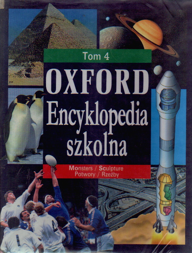 7-tomowa (6 + indeks) oksfordzka encyklopedia szkolna zawiera 2000 haseł, 3000 kolorowych ilustracji, w tym 1500 zdjęć, 500 życiorysów wybitnych ludzi. Encyklopedia jest po polsku, ale uwaga: układ haseł alfabetyczny wg odpowiednich słów angielskich np. hasło KSIĄŻKI będzie w t. 1 na literę B czyli BOOKS czy hasło RYBY będzie w t. 2 na literę F czyli FISH. Tom 4 Monsters/Sculpture - Potwory/Rzeźby.