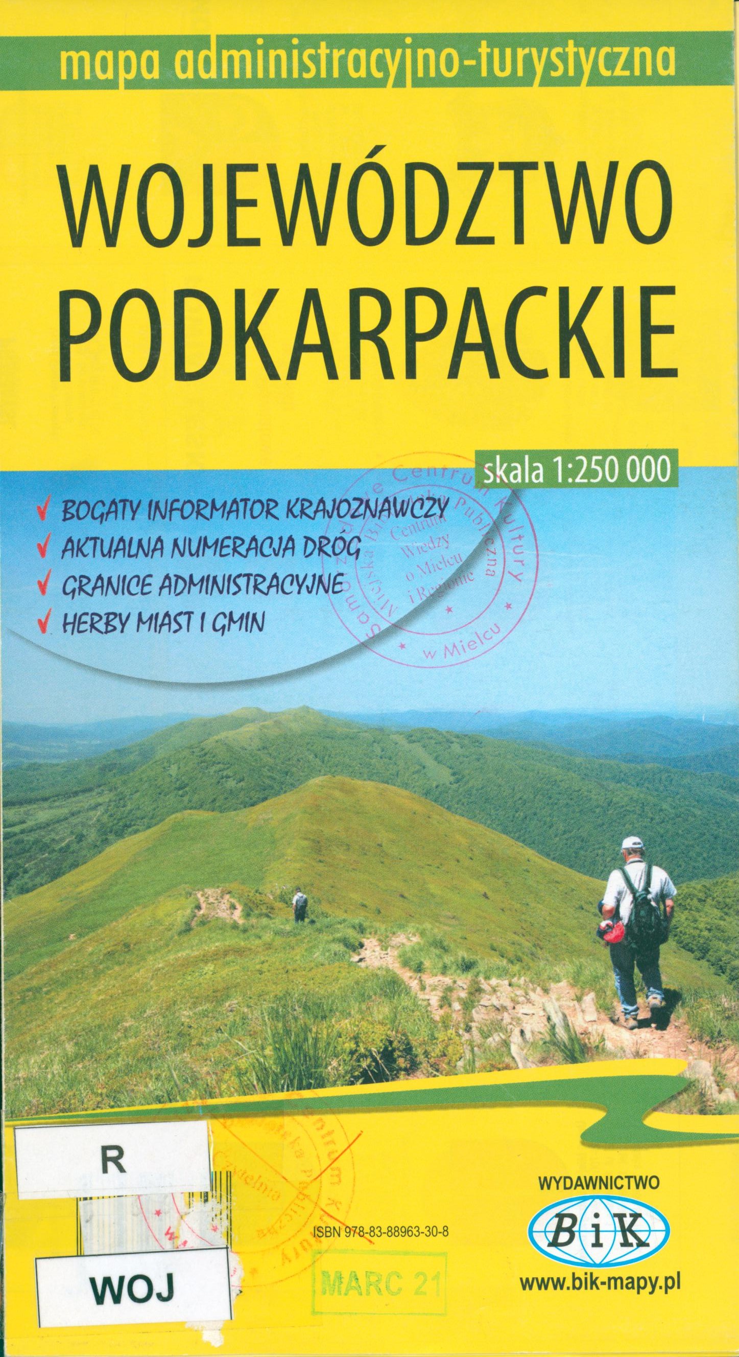 Bogaty informator krajoznawczy, aktualna numeracja dróg, granice administracyjne, herby miast i gmin.