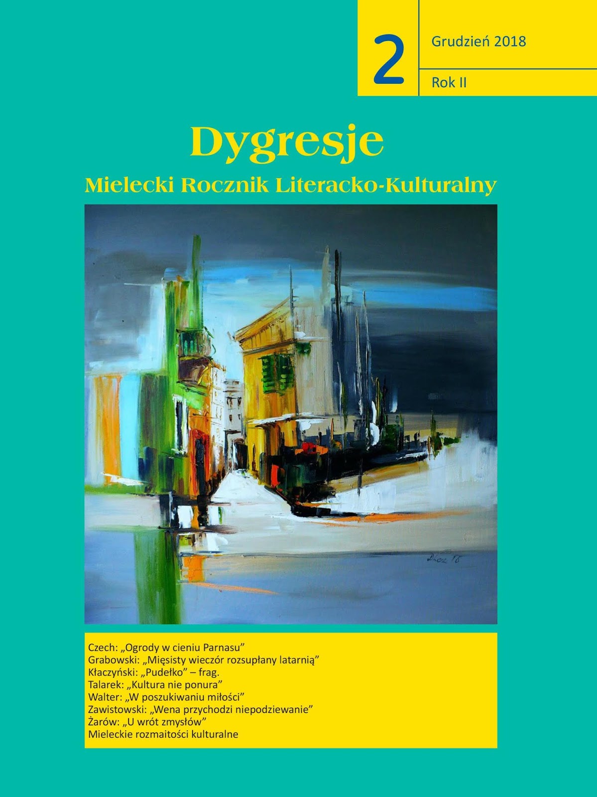Drugi numer „Dygresji” - Mieleckiego Rocznika Literacko-Kulturalnego, który, na 246 stronach, zawiera 145 zdjęć i 45 prezentacji z różnych dziedzin literatury. Pismo przedstawia bogatą plejadę autorów, wśród których wiedzie prym aż dwudziestu czterech poetów i pięciu prozaików. W numerze, po raz pierwszy, pojawił się rozdział wywiady, są krótkie formy satyryczne, a także felietony Andrzeja Talarka, teksty krytyczno-literackie, artykuły publicystyczne dotyczące działalności warszawskiej Fundacji „Arkona”, dokumentacja rocznej działalności literackiej wydawcy rocznika - Mieleckiego Towarzystwa Literackiego, bogata galeria fotograficzna oraz nowości wydawnicze MTL powstałe w przeciągu 2018 roku. Można tam także znaleźć, na okładce i w tekście, zdjęcia obrazów znanej mieleckiej malarki Doroty Łaz. Bogactwo jej twórczości ozdabia karty rocznika plejadą tematów.