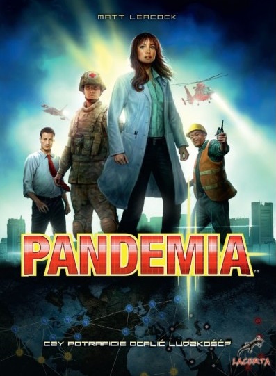 Pandemia / Matt Leacock ; grafika Chris Quilliams ; tłumaczenie Przemysław Korzeniewski. - Wrocław : Wydawnictwo Lacerta, copyright 2013. - 1 pudełko (wiele elementów) : karton, plastik, kolor ; 22x31x5 cm + instrukcja (7, [1] strona : ilustracje ; 30 cm).